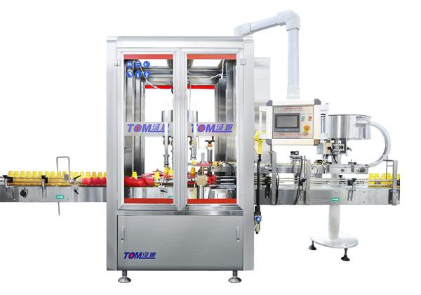 This is our newly developed capping machine, integrates bottle inlet, cap sort, cap feed, capping, bottle outlet together. Well suitable for diversified caps, also very friendly applicable for anti-theft caps. Caps are grasped and positioned well, harmless to caps during the machine running. Fast speed of machine and high qualified rate of capping, it bears step less adjusting, can reach the international advanced level of similar products.
